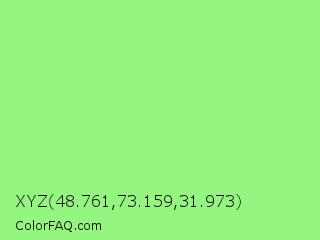 XYZ 48.761,73.159,31.973 Color is a light green color and the nearest color is Light Green #90ee90. Hex code #94f580 and RGB value is rgb(148,245,128). In RGB color space, this color is composed of 58% red, 96% green, 50% blue, In CMYK color space, this color is composed of 40% cyan, 0% magenta, 48% yellow , 4% black , In HSL color space, this color has a hue angle of 110° , 85% saturation and 73% lightness.