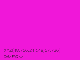 XYZ 48.766,24.148,67.736 Color is a normal magenta color and the nearest color is Hot Magenta #ff1dce. Hex code #f017d9 and RGB value is rgb(240,23,217). In RGB color space, this color is composed of 94% red, 9% green, 85% blue, In CMYK color space, this color is composed of 0% cyan, 90% magenta, 10% yellow , 6% black , In HSL color space, this color has a hue angle of 306° , 88% saturation and 52% lightness.