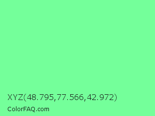 XYZ 48.795,77.566,42.972 Color is a light green color and the nearest color is Very Light Malachite Green #64e986. Hex code #74ff9a and RGB value is rgb(116,255,154). In RGB color space, this color is composed of 45% red, 100% green, 60% blue, In CMYK color space, this color is composed of 55% cyan, 0% magenta, 40% yellow , 0% black , In HSL color space, this color has a hue angle of 136° , 100% saturation and 73% lightness.