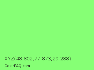 XYZ 48.802,77.873,29.288 Color is a light green color and the nearest color is Light Green #90ee90. Hex code #86ff75 and RGB value is rgb(134,255,117). In RGB color space, this color is composed of 53% red, 100% green, 46% blue, In CMYK color space, this color is composed of 47% cyan, 0% magenta, 54% yellow , 0% black , In HSL color space, this color has a hue angle of 113° , 100% saturation and 73% lightness.