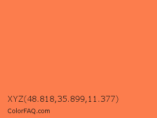 XYZ 48.818,35.899,11.377 Color is a light orange color and the nearest color is Coral #ff7f50. Hex code #fc7d4d and RGB value is rgb(252,125,77). In RGB color space, this color is composed of 99% red, 49% green, 30% blue, In CMYK color space, this color is composed of 0% cyan, 50% magenta, 69% yellow , 1% black , In HSL color space, this color has a hue angle of 16° , 97% saturation and 65% lightness.