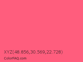 XYZ 48.856,30.569,22.728 Color is a light red color and the nearest color is Brink Pink #fb607f. Hex code #ff5d7d and RGB value is rgb(255,93,125). In RGB color space, this color is composed of 100% red, 36% green, 49% blue, In CMYK color space, this color is composed of 0% cyan, 64% magenta, 51% yellow , 0% black , In HSL color space, this color has a hue angle of 348° , 100% saturation and 68% lightness.