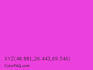 XYZ 48.881,26.443,69.546 Color is a normal magenta color and the nearest color is Purple Pizzazz #fe4eda. Hex code #eb40db and RGB value is rgb(235,64,219). In RGB color space, this color is composed of 92% red, 25% green, 86% blue, In CMYK color space, this color is composed of 0% cyan, 73% magenta, 7% yellow , 8% black , In HSL color space, this color has a hue angle of 306° , 81% saturation and 59% lightness.