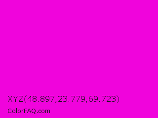 XYZ 48.897,23.779,69.723 Color is a normal magenta color and the nearest color is Purple Pizzazz #ff00cc. Hex code #f004dc and RGB value is rgb(240,4,220). In RGB color space, this color is composed of 94% red, 2% green, 86% blue, In CMYK color space, this color is composed of 0% cyan, 98% magenta, 8% yellow , 6% black , In HSL color space, this color has a hue angle of 305° , 97% saturation and 48% lightness.