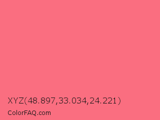 XYZ 48.897,33.034,24.221 Color is a light red color and the nearest color is Ultra Red #fc6c85. Hex code #fa6e80 and RGB value is rgb(250,110,128). In RGB color space, this color is composed of 98% red, 43% green, 50% blue, In CMYK color space, this color is composed of 0% cyan, 56% magenta, 49% yellow , 2% black , In HSL color space, this color has a hue angle of 352° , 93% saturation and 71% lightness.