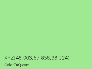 XYZ 48.903,67.858,38.124 Color is a light green color and the nearest color is Granny Smith Apple Crayola #9de093. Hex code #a0e993 and RGB value is rgb(160,233,147). In RGB color space, this color is composed of 63% red, 91% green, 58% blue, In CMYK color space, this color is composed of 31% cyan, 0% magenta, 37% yellow , 9% black , In HSL color space, this color has a hue angle of 111° , 66% saturation and 75% lightness.