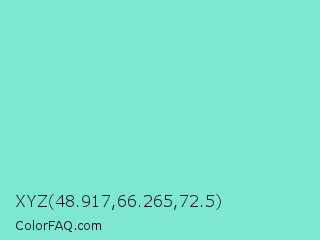 XYZ 48.917,66.265,72.5 Color is a light cyan color and the nearest color is Riptide #8be6d8. Hex code #7de7d4 and RGB value is rgb(125,231,212). In RGB color space, this color is composed of 49% red, 91% green, 83% blue, In CMYK color space, this color is composed of 46% cyan, 0% magenta, 8% yellow , 9% black , In HSL color space, this color has a hue angle of 169° , 69% saturation and 70% lightness.
