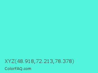 XYZ 48.918,72.213,78.378 Color is a light cyan color and the nearest color is Turquoise #40e0d0. Hex code #52f5db and RGB value is rgb(82,245,219). In RGB color space, this color is composed of 32% red, 96% green, 86% blue, In CMYK color space, this color is composed of 67% cyan, 0% magenta, 11% yellow , 4% black , In HSL color space, this color has a hue angle of 170° , 89% saturation and 64% lightness.