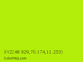 XYZ 48.929,70.174,11.253 Color is a normal lime color and the nearest color is Inch Worm #b0e313. Hex code #b3ed0a and RGB value is rgb(179,237,10). In RGB color space, this color is composed of 70% red, 93% green, 4% blue, In CMYK color space, this color is composed of 24% cyan, 0% magenta, 96% yellow , 7% black , In HSL color space, this color has a hue angle of 75° , 92% saturation and 48% lightness.