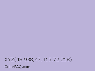 XYZ 48.938,47.415,72.218 Color is a light indigo color and the nearest color is Lavender Gray #bdbbd7. Hex code #bbb2d9 and RGB value is rgb(187,178,217). In RGB color space, this color is composed of 73% red, 70% green, 85% blue, In CMYK color space, this color is composed of 14% cyan, 18% magenta, 0% yellow , 15% black , In HSL color space, this color has a hue angle of 254° , 34% saturation and 77% lightness.