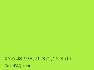 XYZ 48.938,71.371,16.351 Color is a normal green color and the nearest color is Green Lizard #a7f432. Hex code #abf042 and RGB value is rgb(171,240,66). In RGB color space, this color is composed of 67% red, 94% green, 26% blue, In CMYK color space, this color is composed of 29% cyan, 0% magenta, 73% yellow , 6% black , In HSL color space, this color has a hue angle of 84° , 85% saturation and 60% lightness.