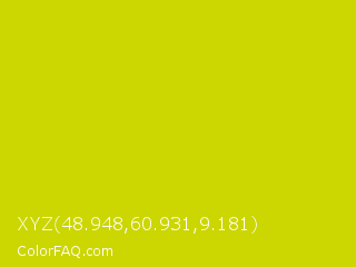 XYZ 48.948,60.931,9.181 Color is a normal yellow color and the nearest color is Bitter Lemon #cae00d. Hex code #ccd600 and RGB value is rgb(204,214,0). In RGB color space, this color is composed of 80% red, 84% green, 0% blue, In CMYK color space, this color is composed of 5% cyan, 0% magenta, 100% yellow , 16% black , In HSL color space, this color has a hue angle of 63° , 100% saturation and 42% lightness.