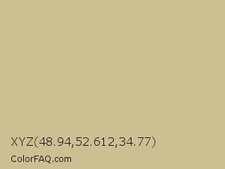XYZ 48.94,52.612,34.77 Color is a light yellow color and the nearest color is Yuma #cec291. Hex code #ccc092 and RGB value is rgb(204,192,146). In RGB color space, this color is composed of 80% red, 75% green, 57% blue, In CMYK color space, this color is composed of 0% cyan, 6% magenta, 28% yellow , 20% black , In HSL color space, this color has a hue angle of 48° , 36% saturation and 69% lightness.
