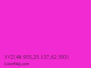 XYZ 48.955,25.137,62.593 Color is a normal magenta color and the nearest color is Razzle Dazzle Rose #ff33cc. Hex code #f22ad1 and RGB value is rgb(242,42,209). In RGB color space, this color is composed of 95% red, 16% green, 82% blue, In CMYK color space, this color is composed of 0% cyan, 83% magenta, 14% yellow , 5% black , In HSL color space, this color has a hue angle of 310° , 88% saturation and 56% lightness.
