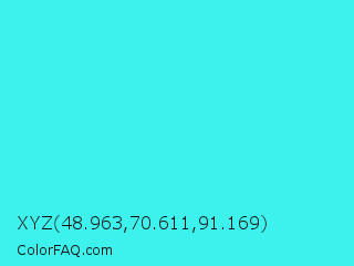 XYZ 48.963,70.611,91.169 Color is a normal cyan color and the nearest color is Turquoise #40e0d0. Hex code #3df2ed and RGB value is rgb(61,242,237). In RGB color space, this color is composed of 24% red, 95% green, 93% blue, In CMYK color space, this color is composed of 75% cyan, 0% magenta, 2% yellow , 5% black , In HSL color space, this color has a hue angle of 178° , 87% saturation and 59% lightness.