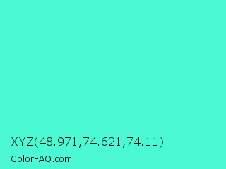 XYZ 48.971,74.621,74.11 Color is a light cyan color and the nearest color is Turquoise #40e0d0. Hex code #4bfad4 and RGB value is rgb(75,250,212). In RGB color space, this color is composed of 29% red, 98% green, 83% blue, In CMYK color space, this color is composed of 70% cyan, 0% magenta, 15% yellow , 2% black , In HSL color space, this color has a hue angle of 167° , 95% saturation and 64% lightness.