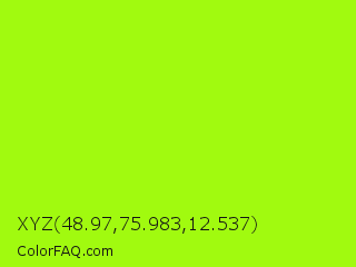 XYZ 48.97,75.983,12.537 Color is a normal green color and the nearest color is Spring Bud #a7fc00. Hex code #a1fa0f and RGB value is rgb(161,250,15). In RGB color space, this color is composed of 63% red, 98% green, 6% blue, In CMYK color space, this color is composed of 36% cyan, 0% magenta, 94% yellow , 2% black , In HSL color space, this color has a hue angle of 83° , 96% saturation and 52% lightness.
