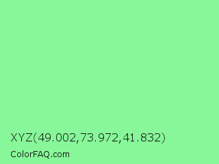 XYZ 49.002,73.972,41.832 Color is a light green color and the nearest color is Light Green #90ee90. Hex code #87f799 and RGB value is rgb(135,247,153). In RGB color space, this color is composed of 53% red, 97% green, 60% blue, In CMYK color space, this color is composed of 45% cyan, 0% magenta, 38% yellow , 3% black , In HSL color space, this color has a hue angle of 130° , 88% saturation and 75% lightness.