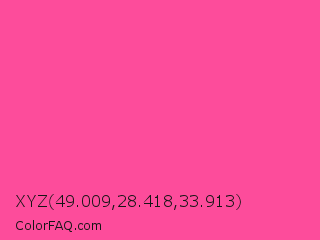 XYZ 49.009,28.418,33.913 Color is a light rose color and the nearest color is Rose Bonbon #f9429e. Hex code #fd4c9b and RGB value is rgb(253,76,155). In RGB color space, this color is composed of 99% red, 30% green, 61% blue, In CMYK color space, this color is composed of 0% cyan, 70% magenta, 39% yellow , 1% black , In HSL color space, this color has a hue angle of 333° , 98% saturation and 65% lightness.