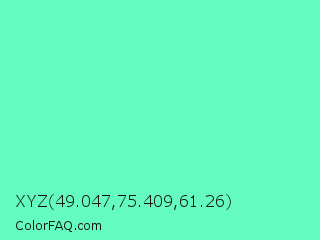 XYZ 49.047,75.409,61.26 Color is a light green color and the nearest color is Aquamarine #7fffd4. Hex code #63fbbf and RGB value is rgb(99,251,191). In RGB color space, this color is composed of 39% red, 98% green, 75% blue, In CMYK color space, this color is composed of 61% cyan, 0% magenta, 24% yellow , 2% black , In HSL color space, this color has a hue angle of 156° , 95% saturation and 69% lightness.