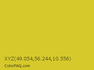 XYZ 49.054,56.244,10.556 Color is a normal yellow color and the nearest color is Sunflower #e4d422. Hex code #d6c92b and RGB value is rgb(214,201,43). In RGB color space, this color is composed of 84% red, 79% green, 17% blue, In CMYK color space, this color is composed of 0% cyan, 6% magenta, 80% yellow , 16% black , In HSL color space, this color has a hue angle of 55° , 68% saturation and 50% lightness.