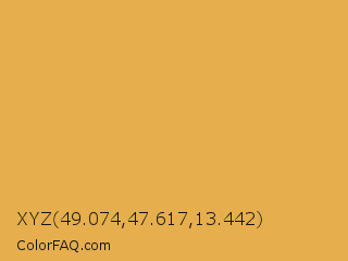 XYZ 49.074,47.617,13.442 Color is a normal orange color and the nearest color is Anzac #e0b646. Hex code #e6ae4c and RGB value is rgb(230,174,76). In RGB color space, this color is composed of 90% red, 68% green, 30% blue, In CMYK color space, this color is composed of 0% cyan, 24% magenta, 67% yellow , 10% black , In HSL color space, this color has a hue angle of 38° , 75% saturation and 60% lightness.