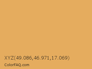 XYZ 49.086,46.971,17.069 Color is a light orange color and the nearest color is Earth Yellow #e1a95f. Hex code #e5ac5e and RGB value is rgb(229,172,94). In RGB color space, this color is composed of 90% red, 67% green, 37% blue, In CMYK color space, this color is composed of 0% cyan, 25% magenta, 59% yellow , 10% black , In HSL color space, this color has a hue angle of 35° , 72% saturation and 63% lightness.