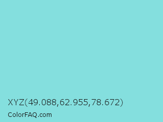 XYZ 49.088,62.955,78.672 Color is a light cyan color and the nearest color is Riptide #8be6d8. Hex code #84dfde and RGB value is rgb(132,223,222). In RGB color space, this color is composed of 52% red, 87% green, 87% blue, In CMYK color space, this color is composed of 41% cyan, 0% magenta, 0% yellow , 13% black , In HSL color space, this color has a hue angle of 179° , 59% saturation and 70% lightness.