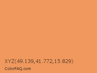 XYZ 49.139,41.772,15.829 Color is a light orange color and the nearest color is Tan Hide #fa9d5a. Hex code #f0985d and RGB value is rgb(240,152,93). In RGB color space, this color is composed of 94% red, 60% green, 36% blue, In CMYK color space, this color is composed of 0% cyan, 37% magenta, 61% yellow , 6% black , In HSL color space, this color has a hue angle of 24° , 83% saturation and 65% lightness.