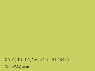 XYZ 49.14,58.919,20.587 Color is a normal yellow color and the nearest color is Tacha #d6c562. Hex code #c9d163 and RGB value is rgb(201,209,99). In RGB color space, this color is composed of 79% red, 82% green, 39% blue, In CMYK color space, this color is composed of 4% cyan, 0% magenta, 53% yellow , 18% black , In HSL color space, this color has a hue angle of 64° , 54% saturation and 60% lightness.