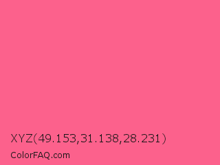 XYZ 49.153,31.138,28.231 Color is a light rose color and the nearest color is Strawberry #fc5a8d. Hex code #fc618c and RGB value is rgb(252,97,140). In RGB color space, this color is composed of 99% red, 38% green, 55% blue, In CMYK color space, this color is composed of 0% cyan, 62% magenta, 44% yellow , 1% black , In HSL color space, this color has a hue angle of 343° , 96% saturation and 68% lightness.