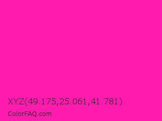 XYZ 49.175,25.061,41.781 Color is a normal magenta color and the nearest color is Persian Rose #fe28a2. Hex code #ff1bad and RGB value is rgb(255,27,173). In RGB color space, this color is composed of 100% red, 11% green, 68% blue, In CMYK color space, this color is composed of 0% cyan, 89% magenta, 32% yellow , 0% black , In HSL color space, this color has a hue angle of 322° , 100% saturation and 55% lightness.