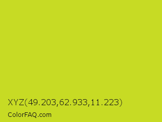 XYZ 49.203,62.933,11.223 Color is a normal yellow color and the nearest color is Pear #d1e231. Hex code #c7db24 and RGB value is rgb(199,219,36). In RGB color space, this color is composed of 78% red, 86% green, 14% blue, In CMYK color space, this color is composed of 9% cyan, 0% magenta, 84% yellow , 14% black , In HSL color space, this color has a hue angle of 67° , 72% saturation and 50% lightness.