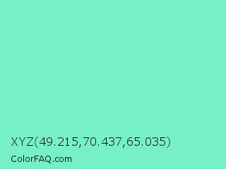 XYZ 49.215,70.437,65.035 Color is a light green color and the nearest color is Aquamarine #7fffd4. Hex code #78f0c7 and RGB value is rgb(120,240,199). In RGB color space, this color is composed of 47% red, 94% green, 78% blue, In CMYK color space, this color is composed of 50% cyan, 0% magenta, 17% yellow , 6% black , In HSL color space, this color has a hue angle of 160° , 80% saturation and 71% lightness.