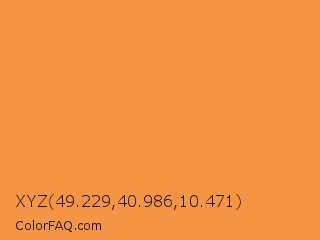 XYZ 49.229,40.986,10.471 Color is a light orange color and the nearest color is Jaffa #ef863f. Hex code #f59442 and RGB value is rgb(245,148,66). In RGB color space, this color is composed of 96% red, 58% green, 26% blue, In CMYK color space, this color is composed of 0% cyan, 40% magenta, 73% yellow , 4% black , In HSL color space, this color has a hue angle of 27° , 90% saturation and 61% lightness.