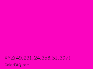 XYZ 49.231,24.358,51.397 Color is a normal magenta color and the nearest color is Shocking Pink #fc0fc0. Hex code #fb04bf and RGB value is rgb(251,4,191). In RGB color space, this color is composed of 98% red, 2% green, 75% blue, In CMYK color space, this color is composed of 0% cyan, 98% magenta, 24% yellow , 2% black , In HSL color space, this color has a hue angle of 315° , 97% saturation and 50% lightness.