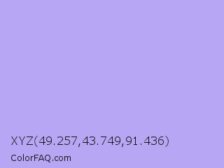 XYZ 49.257,43.749,91.436 Color is a light indigo color and the nearest color is Biloba Flower #b2a1ea. Hex code #b6a6f4 and RGB value is rgb(182,166,244). In RGB color space, this color is composed of 71% red, 65% green, 96% blue, In CMYK color space, this color is composed of 25% cyan, 32% magenta, 0% yellow , 4% black , In HSL color space, this color has a hue angle of 252° , 78% saturation and 80% lightness.