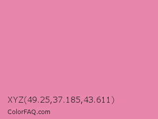 XYZ 49.25,37.185,43.611 Color is a light rose color and the nearest color is Carissma #ea88a8. Hex code #e886ac and RGB value is rgb(232,134,172). In RGB color space, this color is composed of 91% red, 53% green, 67% blue, In CMYK color space, this color is composed of 0% cyan, 42% magenta, 26% yellow , 9% black , In HSL color space, this color has a hue angle of 337° , 68% saturation and 72% lightness.