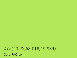 XYZ 49.25,68.018,19.984 Color is a light green color and the nearest color is Inchworm #b2ec5d. Hex code #b3e859 and RGB value is rgb(179,232,89). In RGB color space, this color is composed of 70% red, 91% green, 35% blue, In CMYK color space, this color is composed of 23% cyan, 0% magenta, 62% yellow , 9% black , In HSL color space, this color has a hue angle of 82° , 76% saturation and 63% lightness.