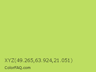 XYZ 49.265,63.924,21.051 Color is a light lime color and the nearest color is June Bud #bdda57. Hex code #bdde61 and RGB value is rgb(189,222,97). In RGB color space, this color is composed of 74% red, 87% green, 38% blue, In CMYK color space, this color is composed of 15% cyan, 0% magenta, 56% yellow , 13% black , In HSL color space, this color has a hue angle of 76° , 65% saturation and 63% lightness.