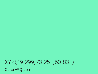 XYZ 49.299,73.251,60.831 Color is a light green color and the nearest color is Aquamarine #7fffd4. Hex code #72f6bf and RGB value is rgb(114,246,191). In RGB color space, this color is composed of 45% red, 96% green, 75% blue, In CMYK color space, this color is composed of 54% cyan, 0% magenta, 22% yellow , 4% black , In HSL color space, this color has a hue angle of 155° , 88% saturation and 71% lightness.