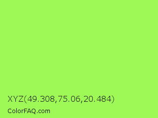 XYZ 49.308,75.06,20.484 Color is a light green color and the nearest color is Inchworm #b2ec5d. Hex code #9ef855 and RGB value is rgb(158,248,85). In RGB color space, this color is composed of 62% red, 97% green, 33% blue, In CMYK color space, this color is composed of 36% cyan, 0% magenta, 66% yellow , 3% black , In HSL color space, this color has a hue angle of 93° , 92% saturation and 65% lightness.