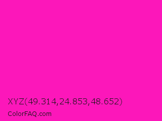 XYZ 49.314,24.853,48.652 Color is a normal magenta color and the nearest color is Shocking Pink #fc0fc0. Hex code #fc17ba and RGB value is rgb(252,23,186). In RGB color space, this color is composed of 99% red, 9% green, 73% blue, In CMYK color space, this color is composed of 0% cyan, 91% magenta, 26% yellow , 1% black , In HSL color space, this color has a hue angle of 317° , 97% saturation and 54% lightness.