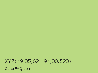 XYZ 49.35,62.194,30.523 Color is a light green color and the nearest color is Yellow Green #c5e17a. Hex code #bada82 and RGB value is rgb(186,218,130). In RGB color space, this color is composed of 73% red, 85% green, 51% blue, In CMYK color space, this color is composed of 15% cyan, 0% magenta, 40% yellow , 15% black , In HSL color space, this color has a hue angle of 82° , 54% saturation and 68% lightness.