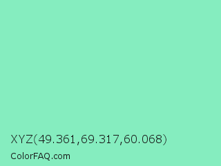 XYZ 49.361,69.317,60.068 Color is a light green color and the nearest color is Algae Green #93dfb8. Hex code #85edbf and RGB value is rgb(133,237,191). In RGB color space, this color is composed of 52% red, 93% green, 75% blue, In CMYK color space, this color is composed of 44% cyan, 0% magenta, 19% yellow , 7% black , In HSL color space, this color has a hue angle of 153° , 74% saturation and 73% lightness.