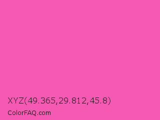 XYZ 49.365,29.812,45.8 Color is a light magenta color and the nearest color is Brilliant Rose #f653a6. Hex code #f559b3 and RGB value is rgb(245,89,179). In RGB color space, this color is composed of 96% red, 35% green, 70% blue, In CMYK color space, this color is composed of 0% cyan, 64% magenta, 27% yellow , 4% black , In HSL color space, this color has a hue angle of 325° , 89% saturation and 65% lightness.