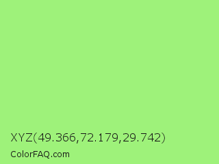 XYZ 49.366,72.179,29.742 Color is a light green color and the nearest color is Light Green #90ee90. Hex code #9ef27a and RGB value is rgb(158,242,122). In RGB color space, this color is composed of 62% red, 95% green, 48% blue, In CMYK color space, this color is composed of 35% cyan, 0% magenta, 50% yellow , 5% black , In HSL color space, this color has a hue angle of 102° , 82% saturation and 71% lightness.