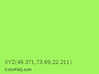 XYZ 49.371,73.69,22.211 Color is a light green color and the nearest color is Inchworm #b2ec5d. Hex code #a1f55e and RGB value is rgb(161,245,94). In RGB color space, this color is composed of 63% red, 96% green, 37% blue, In CMYK color space, this color is composed of 34% cyan, 0% magenta, 62% yellow , 4% black , In HSL color space, this color has a hue angle of 93° , 88% saturation and 66% lightness.