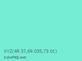 XYZ 49.37,69.035,73.01 Color is a light cyan color and the nearest color is Aquamarine #7fffd4. Hex code #74edd4 and RGB value is rgb(116,237,212). In RGB color space, this color is composed of 45% red, 93% green, 83% blue, In CMYK color space, this color is composed of 51% cyan, 0% magenta, 11% yellow , 7% black , In HSL color space, this color has a hue angle of 168° , 77% saturation and 69% lightness.