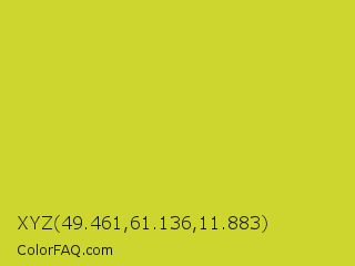 XYZ 49.461,61.136,11.883 Color is a normal yellow color and the nearest color is Pear #d1e231. Hex code #ccd62f and RGB value is rgb(204,214,47). In RGB color space, this color is composed of 80% red, 84% green, 18% blue, In CMYK color space, this color is composed of 5% cyan, 0% magenta, 78% yellow , 16% black , In HSL color space, this color has a hue angle of 64° , 67% saturation and 51% lightness.